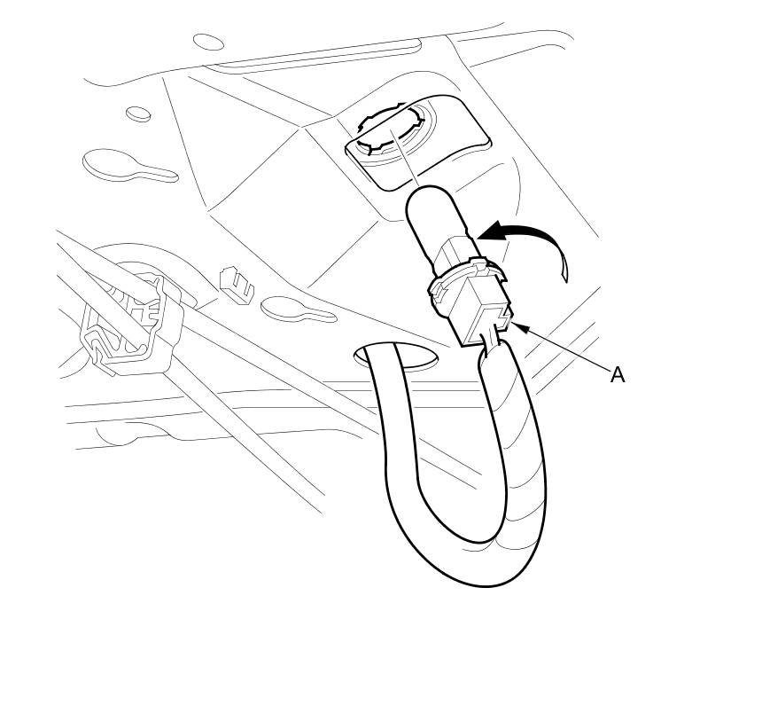2. From the trunk compartment, turn the high mount brake light socket (A) 45 ° counterclockwise to remove the socket. 4-door is shown; 2-door is similar.