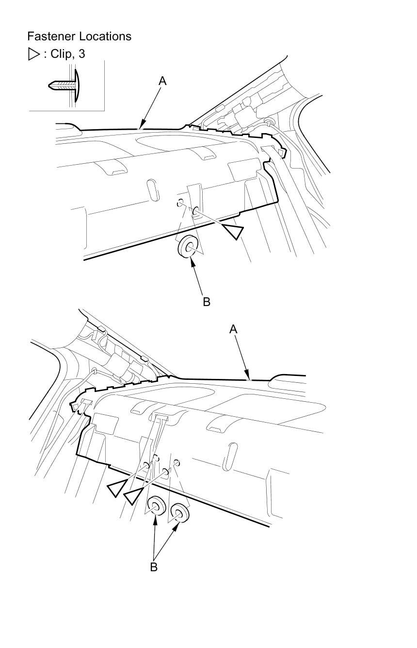 4. Detach the clips securing the rear shelf (A), and remove the washers (B) from between the rear shelf and the body. 4-door is shown; 2-door is similar.