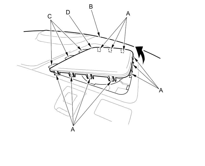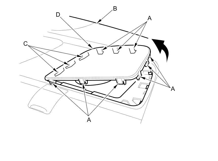6. If necessary, release the hooks (A) from under the rear shelf (B), and release the hooks (C), then remove the rear speaker grille (D). The left side is shown; the right side is similar.