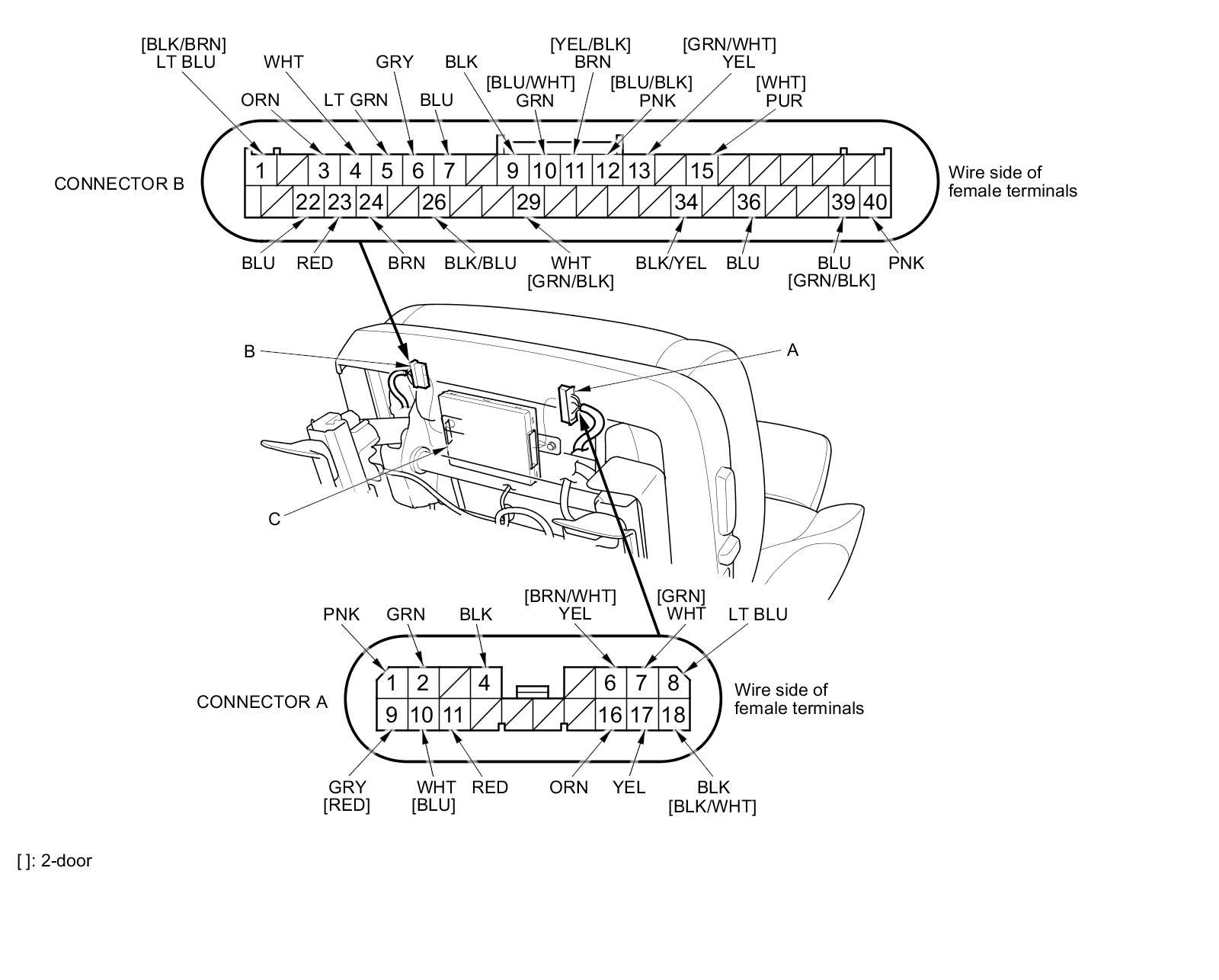 3. Disconnect the 18P connector (A) and 40P connector (B) from the power seat control unit (C).