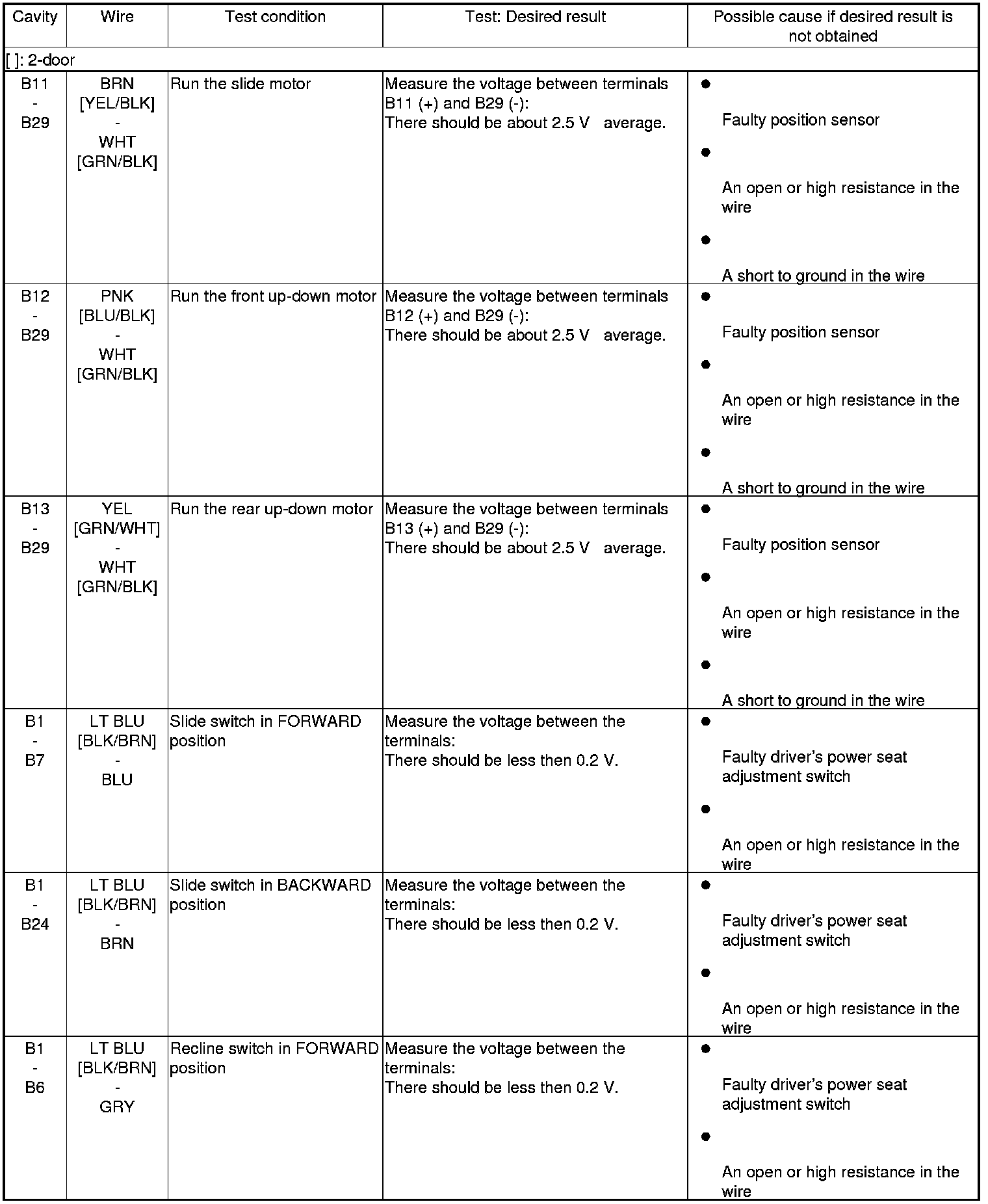 7. Disconnect the connectors from the power seat control unit, and do the following input tests: