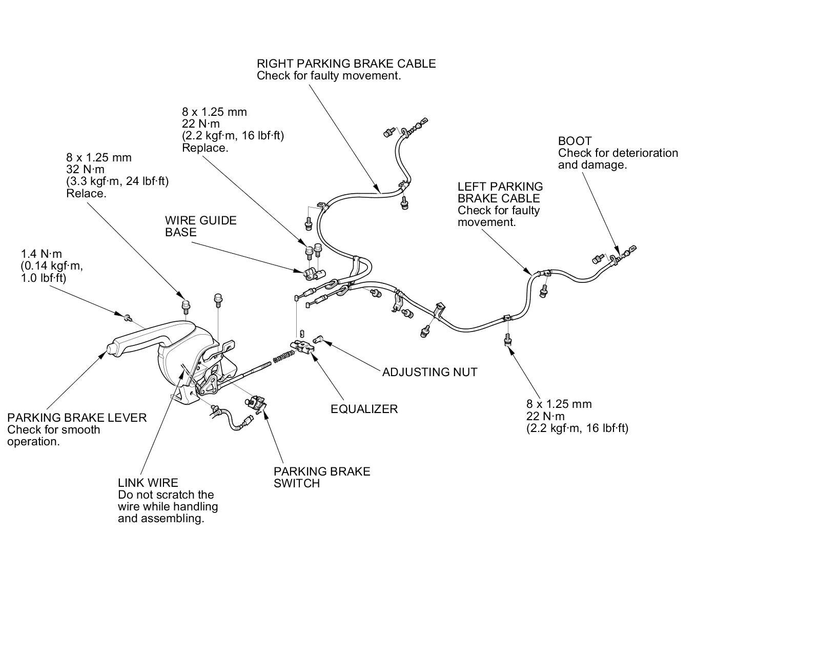 - The parking brake cables must not be bent or distorted. This will lead to stiff operation and premature cable failure.