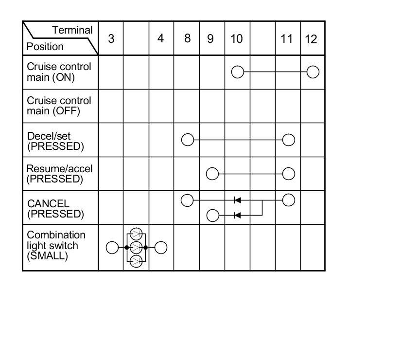 3. Check for continuity between the terminals in each cruise control combination switch position according to the table:
