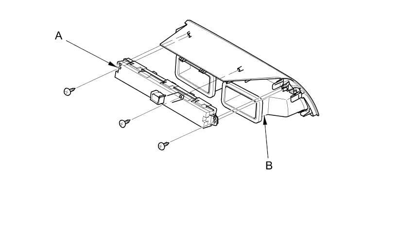 2. Remove the self-tapping screws and the audio-HVAC subdisplay unit (A) from the dashboard center vent (B).