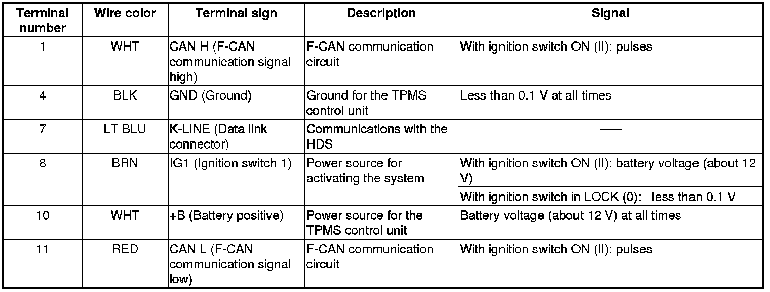 - When the vehicle is traveling more than 28 mph (45 km/h), an RF (radio frequency) band wave signal is transmitted from each tire pressure sensor to the TPMS control unit.
