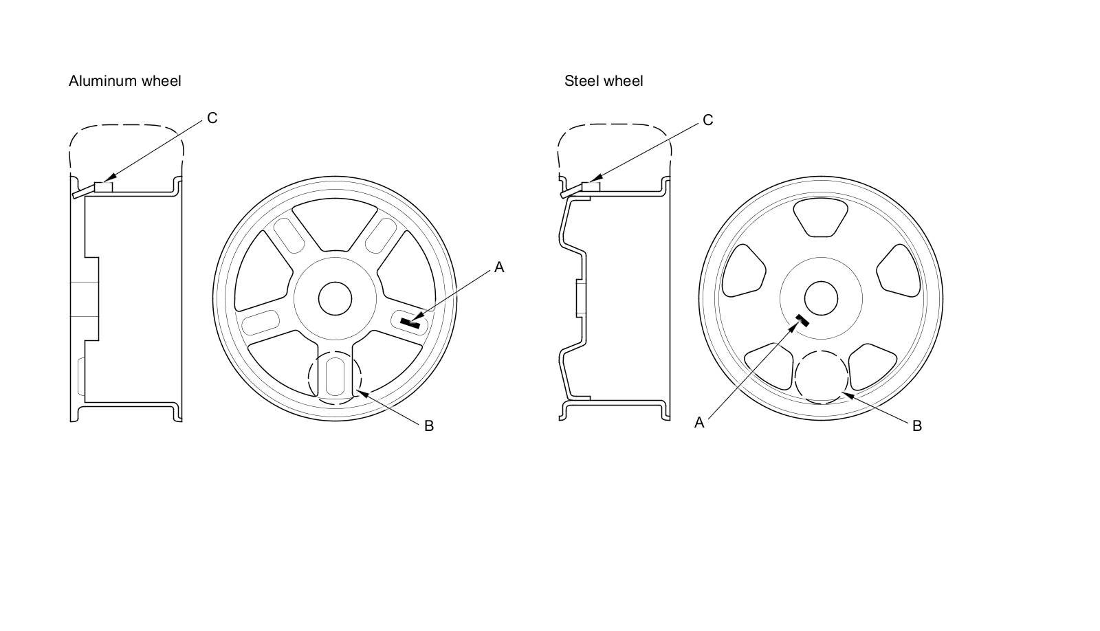 - Steel wheel type: The original equipment wheels have a "TPMS" mark (A) on them, and are counterweighted (B) by adding material on the opposite side of the tire pressure sensor (C), to counterbalance the weight of the sensor.