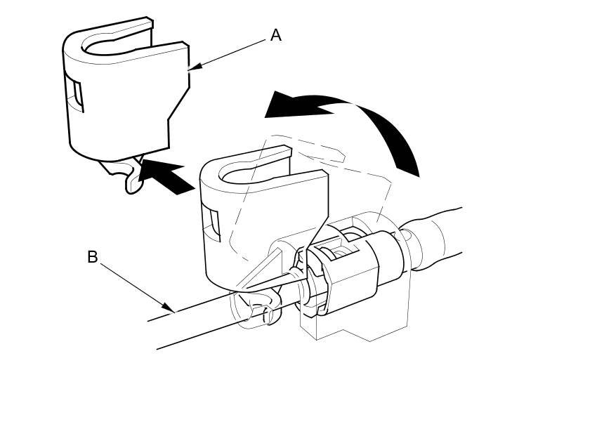 1. If equipped, remove the quick-connect fitting cover from the fuel line. Raise the cover (A) from the fuel line (B), and remove it as shown.