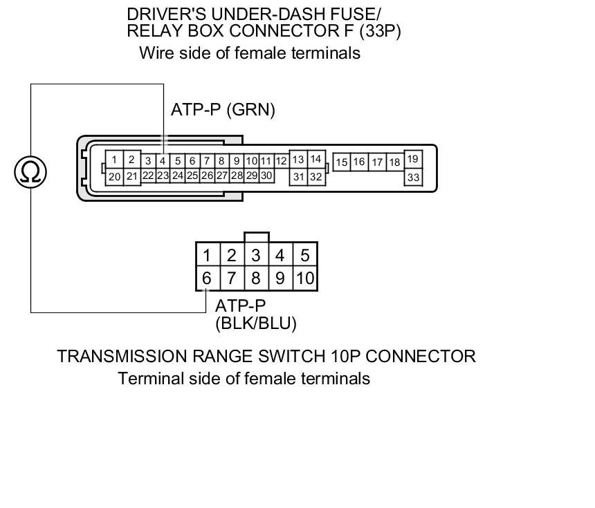 22. Check for continuity between driver's under-dash fuse/relay box connector F (33P) terminal No. 4 and transmission range switch 10P connector terminal No. 6.