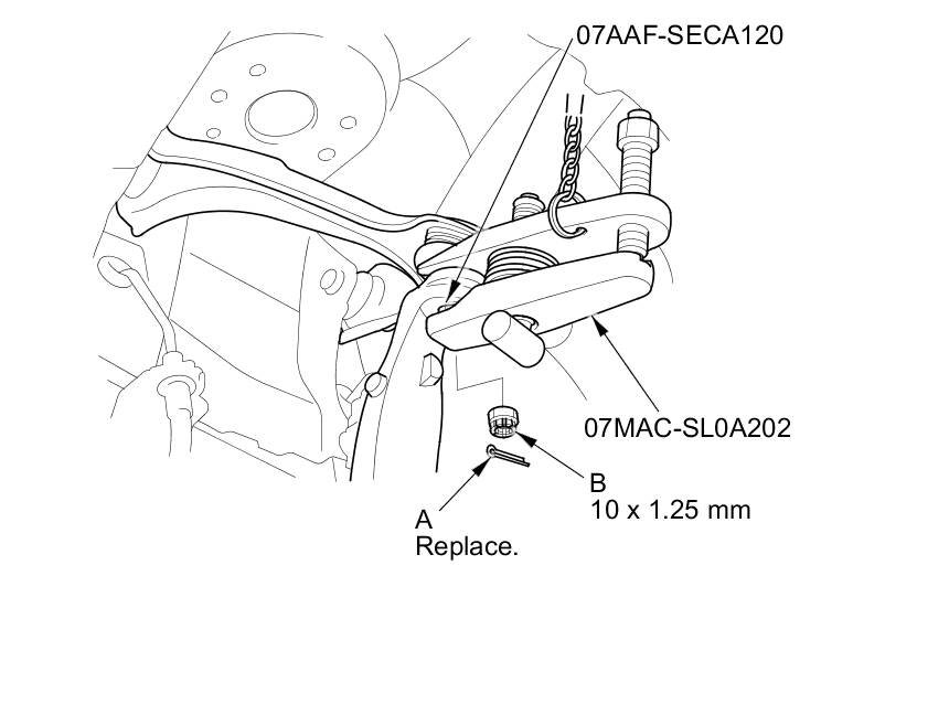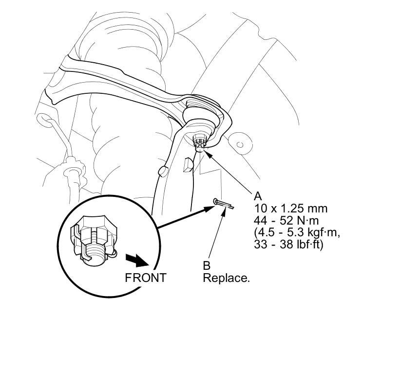 - Insert the new cotter pin (B) into the ball joint pin hole from the front to the rear of the vehicle, and bend its end as shown. Check the ball joint pin hole direction before connecting the ball joint.