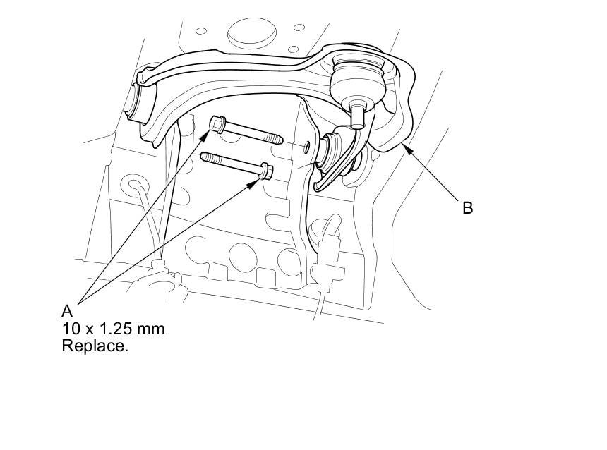 6. Remove the upper arm mounting bolts (A), then remove the upper arm (B).