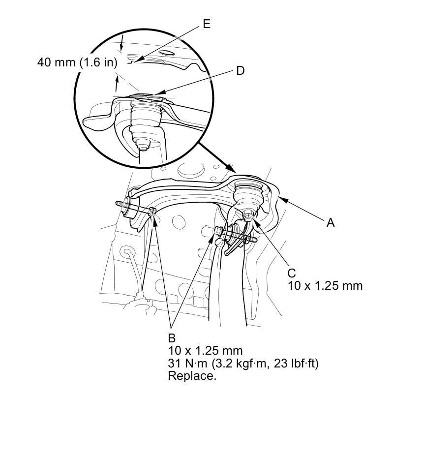 8. Place a floor jack under the lower arm, and raise the suspension until the clearance between the top (D) of the upper arm ball joint and the backside of the fender cut out point (E) is 40 mm (1.6 in), then tighten the upper arm mounting bolts to the specified torque.