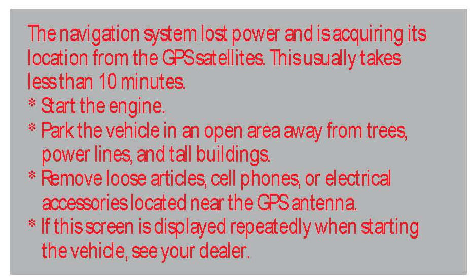 5. If the system does not initialize within 10 minutes, a second screen (shown) appears. The system is still initializing but will not automatically exit to the globe screen when initialization is complete. Do not immediately follow the instructions on the screen. After 30 minutes, try restarting the engine to see if the navigation system completed the initialization. If it did not, follow the instructions on the screen.