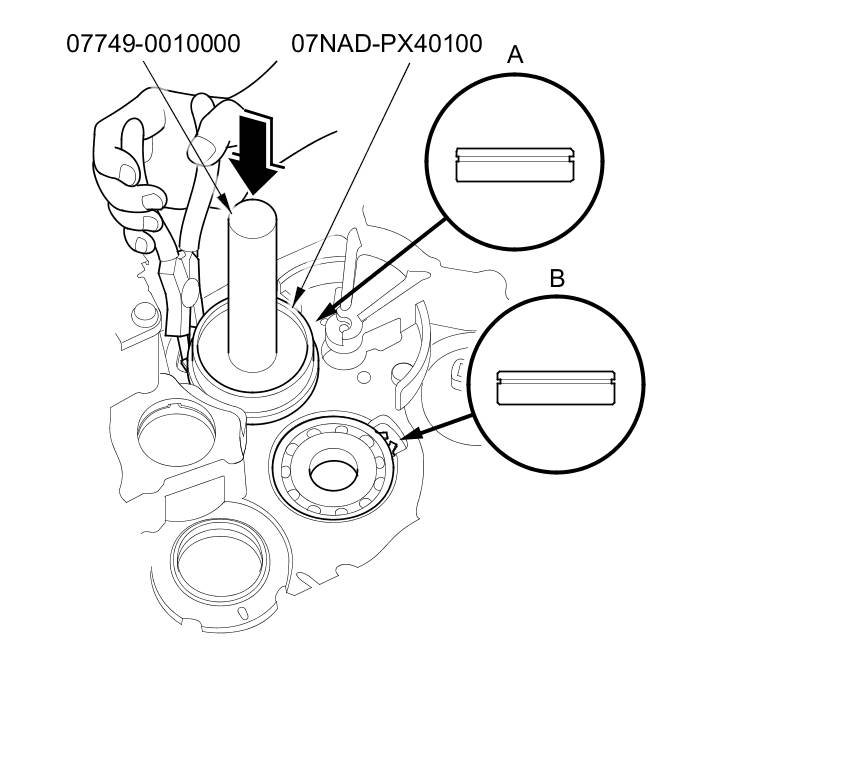 4. Expand the snap ring of the secondary shaft bearing (A) and the idler gear shaft bearing (B) using the snap ring pliers, and install the bearing part-way into the housing using the driver handle and the 42 x 47 mm bearing driver attachment.