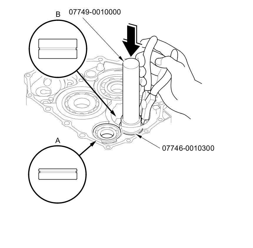 2. Expand each snap ring using snap ring pliers, and install the mainshaft bearing (A) and the countershaft bearing (B) part-way into the housing using the driver handle and the 78 x 80 mm bearing driver attachment.