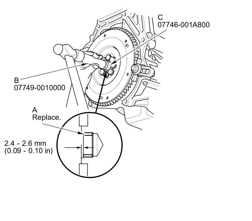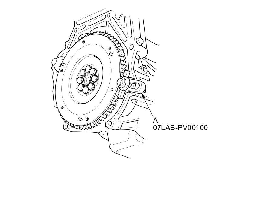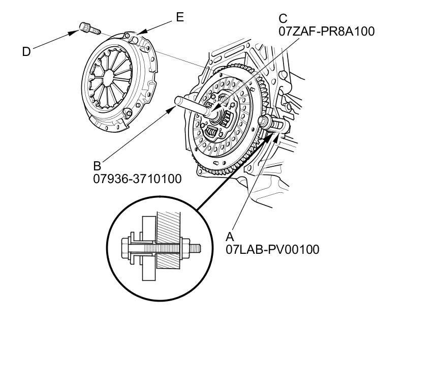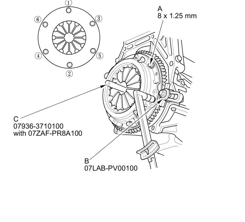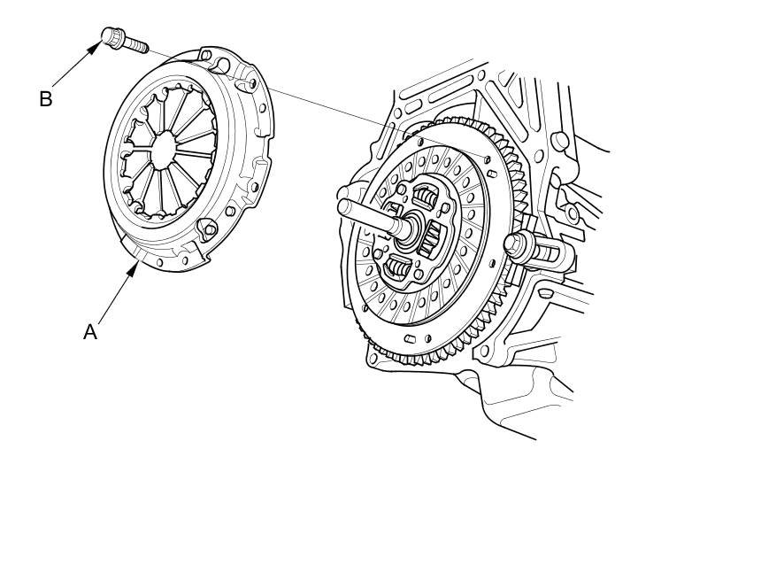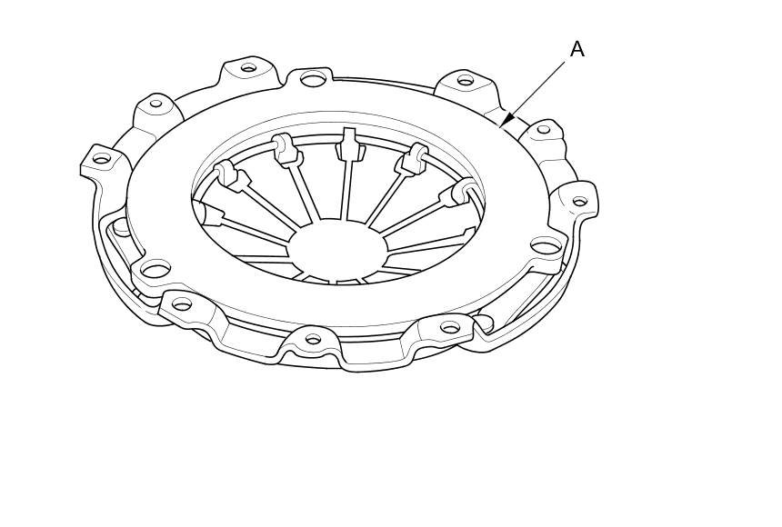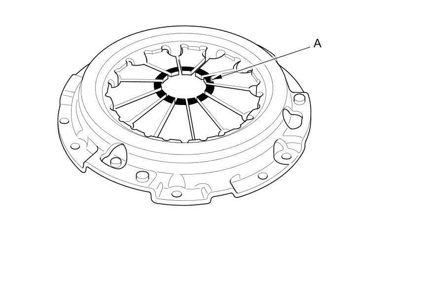 28. Torque the pressure plate mounting bolts (A) in a crisscross pattern. Tighten the bolts in several steps to prevent warping the diaphragm spring. Make sure that there is no clearance between the pressure plate and the flywheel.
