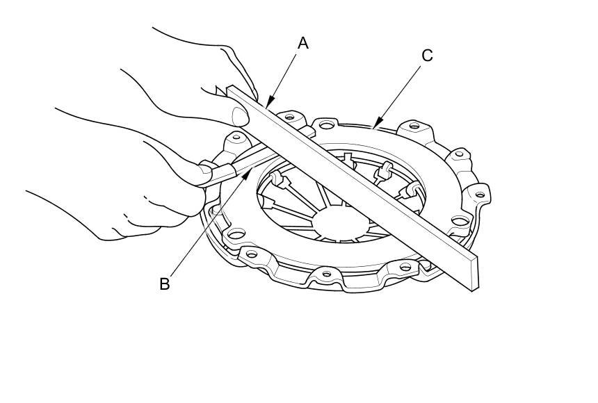 7. Inspect for warpage using a straight edge (A) and a feeler gauge (B). Measure across the pressure plate (C). If the most measurement difference is more than the service limit, replace the pressure plate.