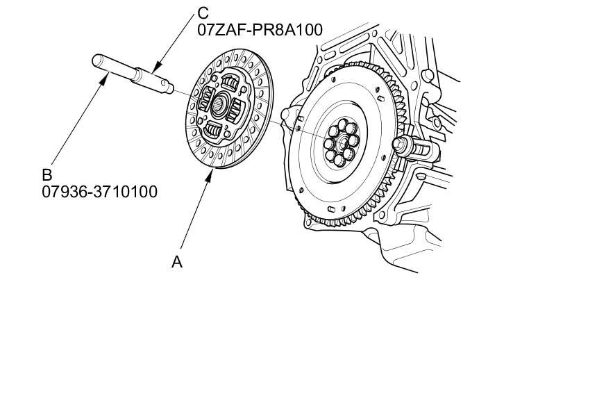 8. Remove the clutch disc (A), the remover handle (B), and the clutch alignment shaft (C).