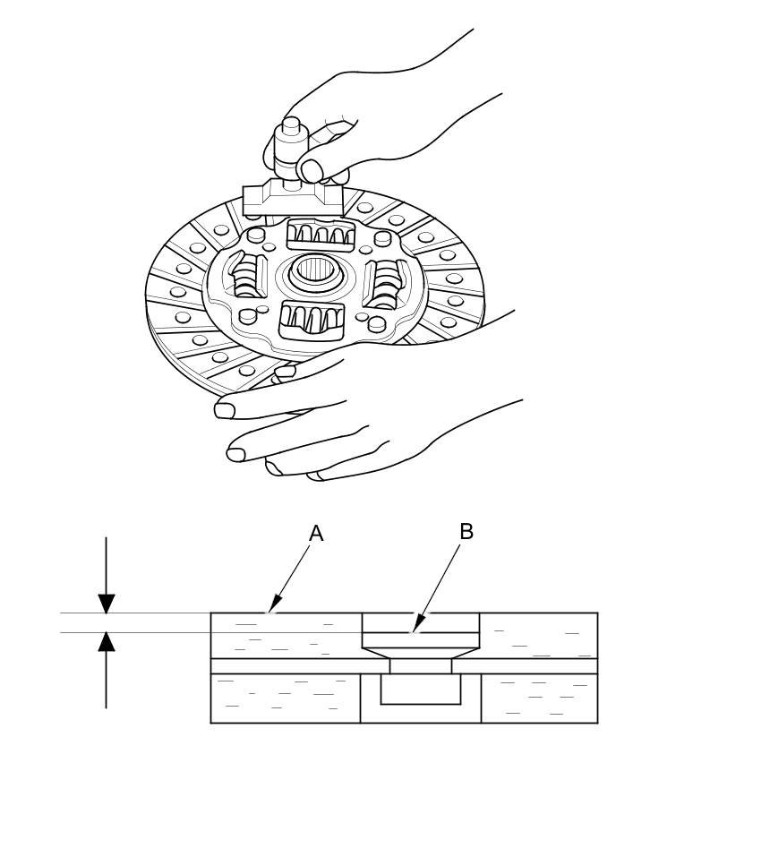11. Measure the depths of the rivets from the clutch disc lining surface (A) to the rivets (B) on both sides. If the measurement is less than the service limit, replace the clutch disc.