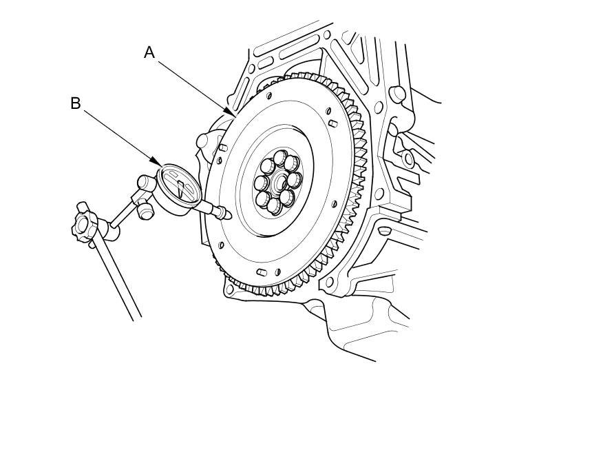 15. Measure the flywheel (A) runout using a dial indicator (B). Through at least two full turns with pushing against the flywheel each time you turn it to take up the crankshaft thrust washer clearance. If the measurement is not within the standard, replace the flywheel, and recheck the runout; go to step 16.