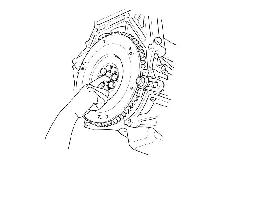 17. Loosen the flywheel mounting bolts in a crisscross pattern in several steps. Remove the bolts, then remove the flywheel and the ring gear holder.