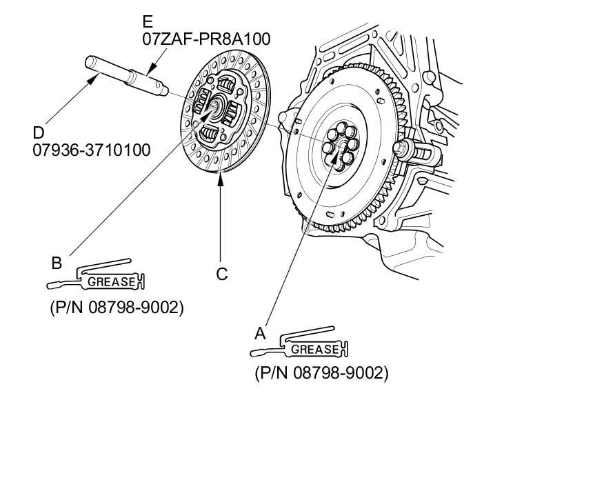 26. Apply super high temp urea grease (P/N 08798-9002) to the splines (B) of the clutch disc (C), then install the clutch disc using the remover handle (D) and the clutch alignment shaft (E).
