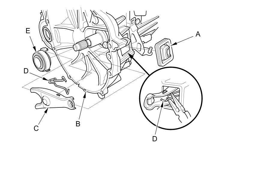 3. Remove the release fork (C) from the clutch housing by squeezing the release fork set spring (D) with pliers. Remove the release bearing (E).