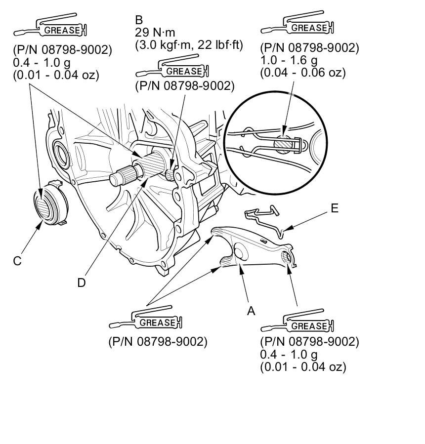 5. Apply super high temp urea grease (P/N 08798-9002) to the release fork (A), the release fork bolt (B), the release bearing (C), and the release bearing guide (D) in the shaded areas, then set the release fork set spring (E).