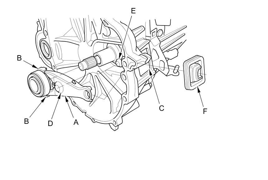 8. Install the release fork boot (F). Make sure the boot seals around the release fork and the clutch housing.