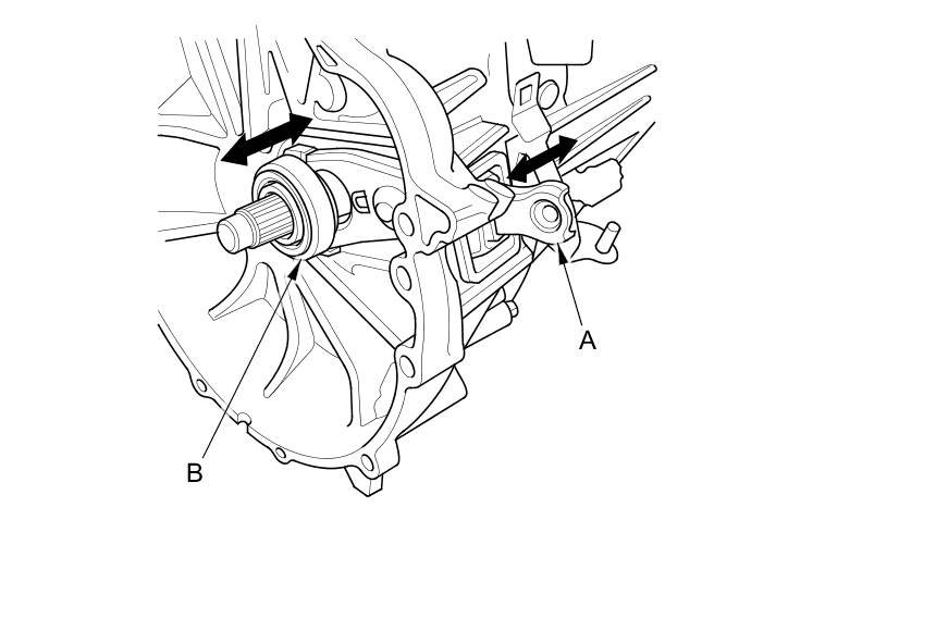 9. Move the release fork (A) right and left to make sure that it fits properly against the release bearing (B) and that the release bearing slides smoothly. Wipe off any excess grease.