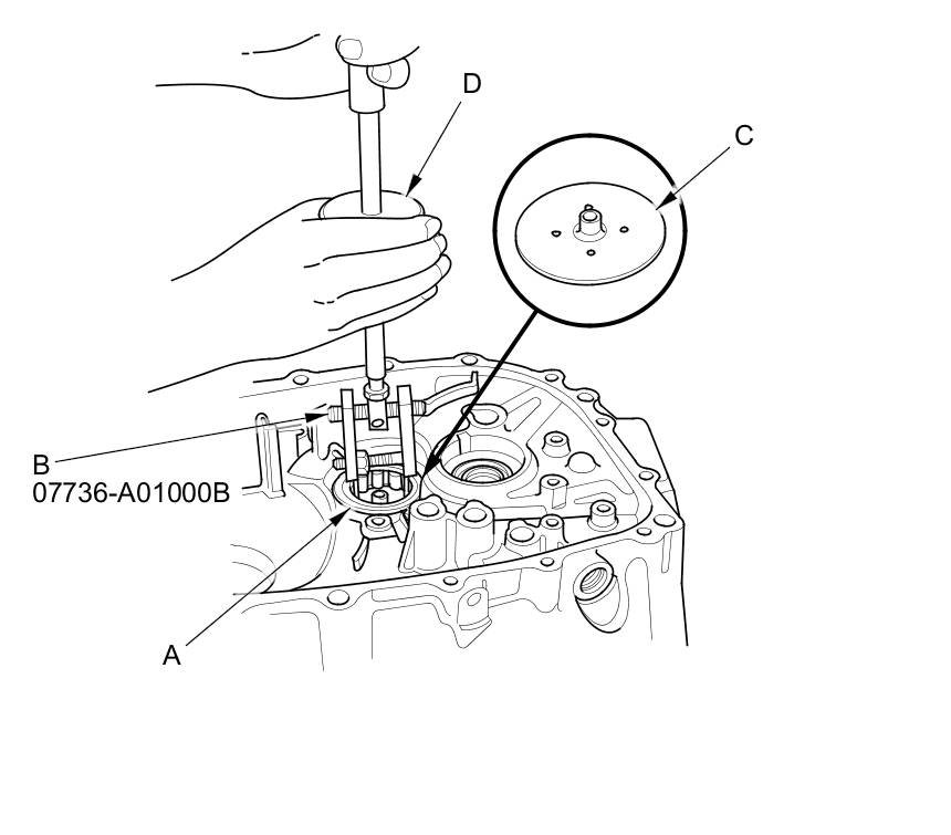 2. Remove the needle bearing (A) using the 25-40 mm adjustable bearing puller (B) and a commercially available 3/8''-16 UNF slide hammer (D), then remove oil guide plate C.