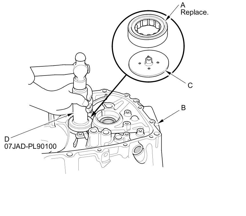 4. Install the needle bearing using the 65 mm oil seal driver (D).