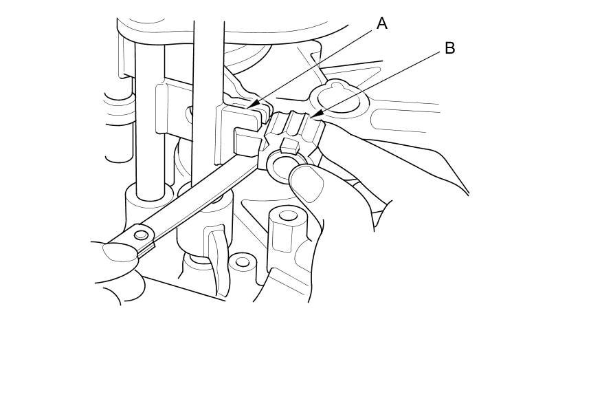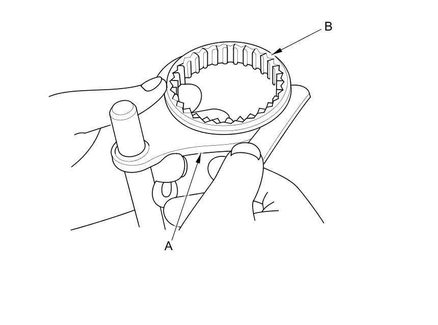 1. Measure the clearance between each shift fork (A) and its matching synchro sleeve (B). If the clearance exceeds the service limit, go to step 2.