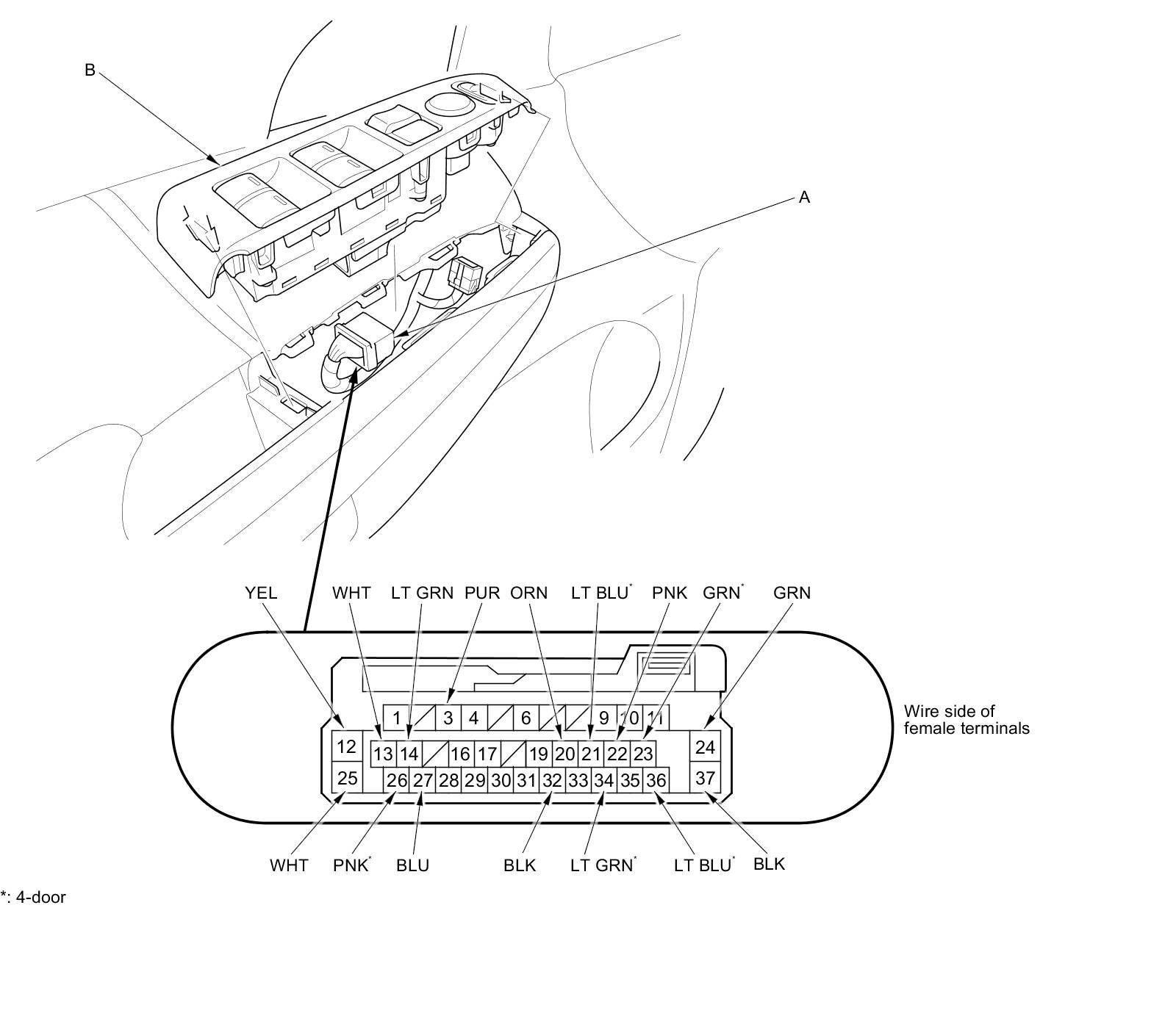 3. Disconnect the 37P connector (A) from the door power window master switch (B).