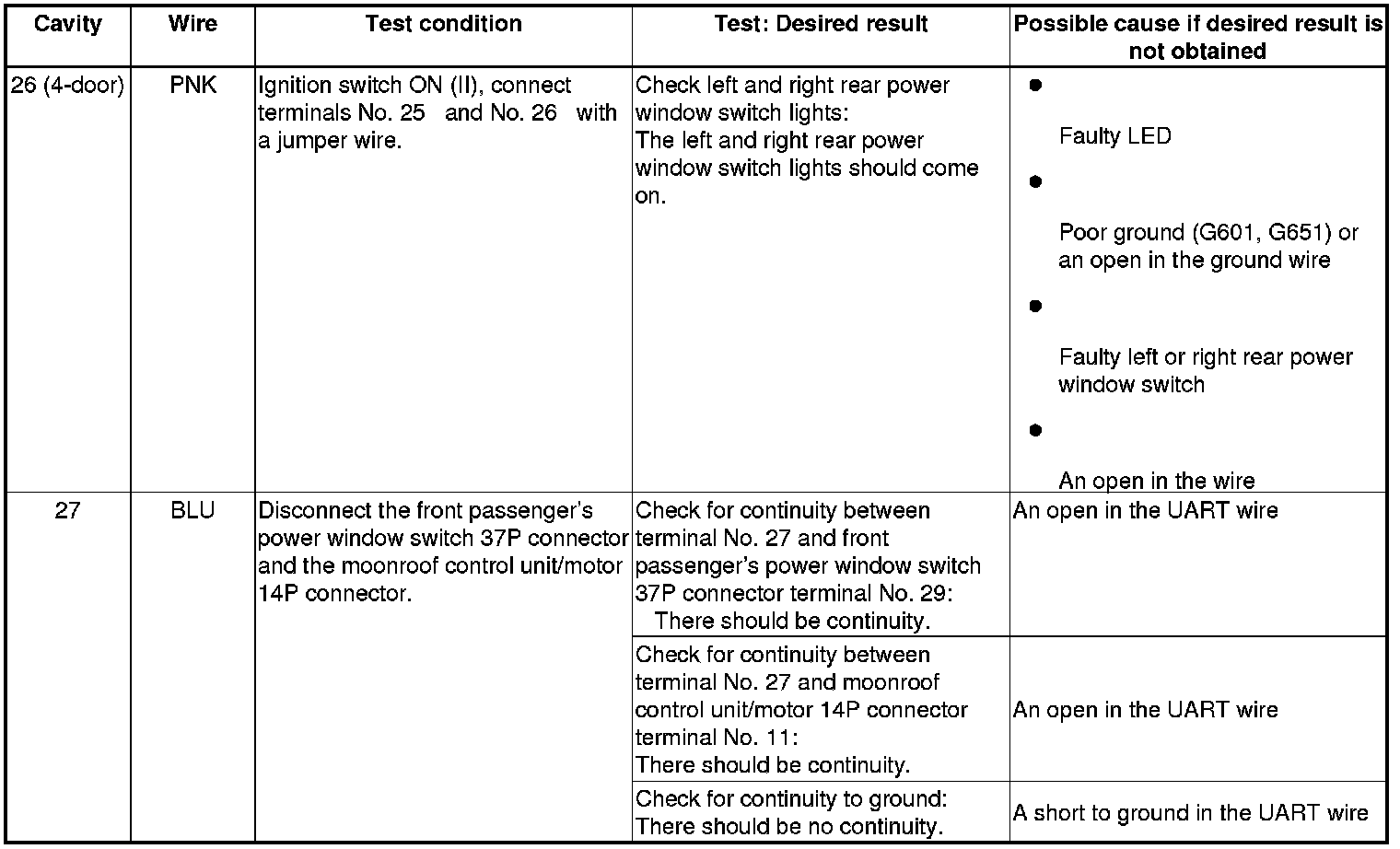 - If all the input tests prove OK, the door multiplex control unit is faulty; replace the power window master switch.