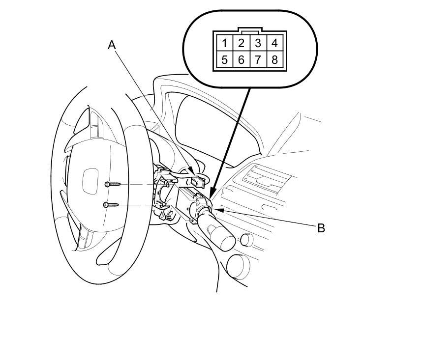 2. Disconnect the dashboard wire harness 8P connector (A) from the wiper/washer switch (B).