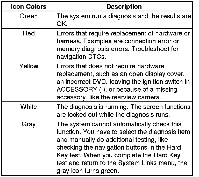 When the diagnosis finishes, the icons turn different colors based on their test status. The color definitions are shown below and can also be seen by selecting Help on the System Links screen.