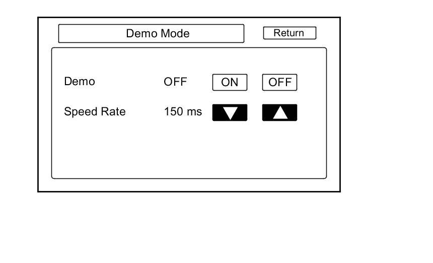 This screen is for factory use only, and should always be set to OFF. Occasionally the DEMO setting is turned ON when vehicles are being used at Auto Shows or similar events. Turning this feature on, allows the navigation system to automatically follow a route to a destination when the vehicle is stationary. The Speed Rate changes the speed of the demo mode.
