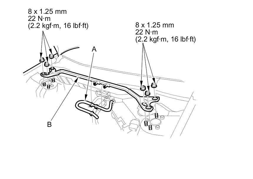 2. Disconnect the brake booster vacuum hose (A) from the strut brace (B).