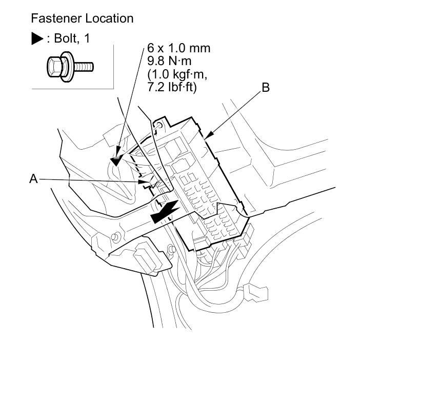 10. From under the driver's dash, remove the driver's under-dash fuse/relay box mounting bolt, and release the hook (A), then lower the driver's under-dash fuse/relay box (B).