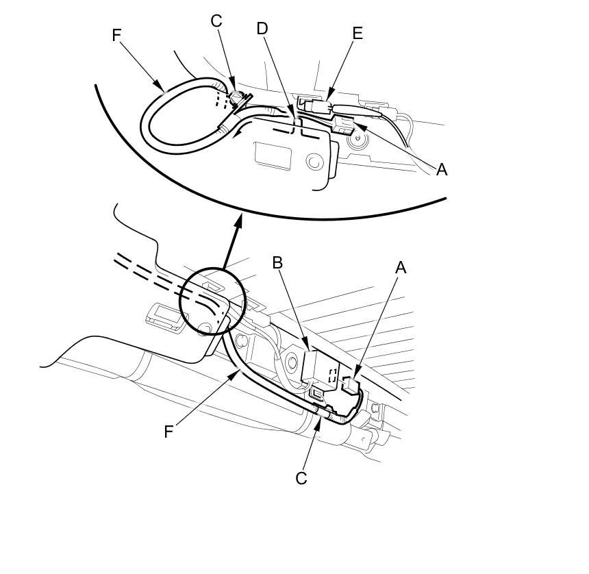 13. 2-door: From the right C-pillar area, disconnect the antenna lead connector (A) from the AM/FM antenna amplifier (B), and detach the harness clip (C). Pass the harness clip and the connector through the gap between the projection (D) of the side curtain airbag bracket and the glass antenna connector (E) by pulling the antenna lead (F) to the headliner side.