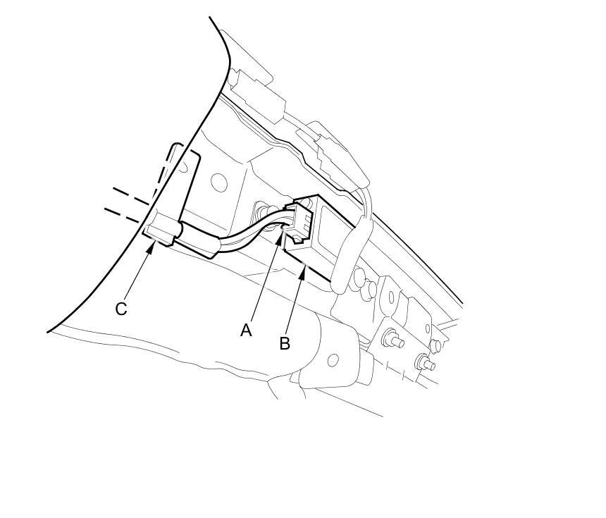 11. From under the driver's dash, disconnect the roof wire harness connector(s) (A), and detach the harness clip (B) and the harness holder (C).