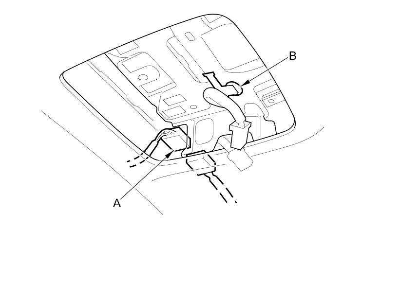 15. For some models: From the roof console opening, disconnect the moonroof subharness connector (A), and detach the harness clip (B).