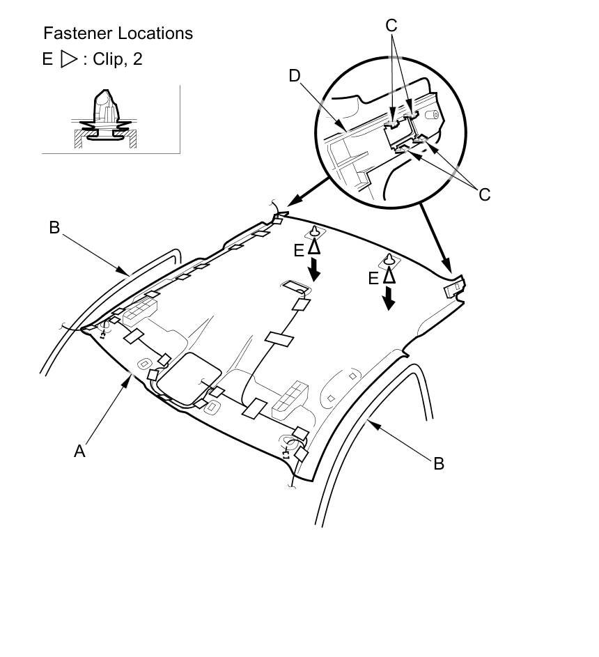 3. With the help of an assistant, detach the rear clips (E) by pulling down the rear area of the headliner.