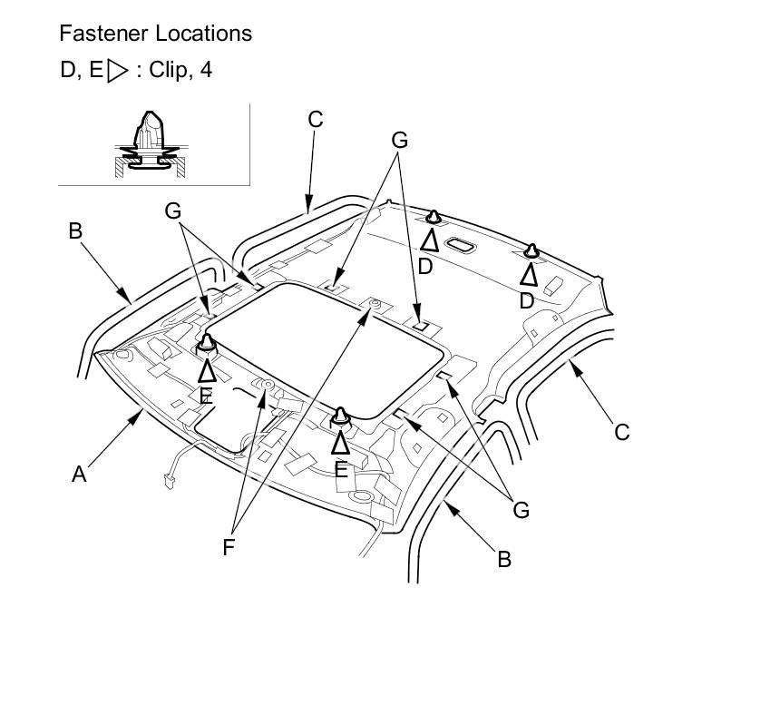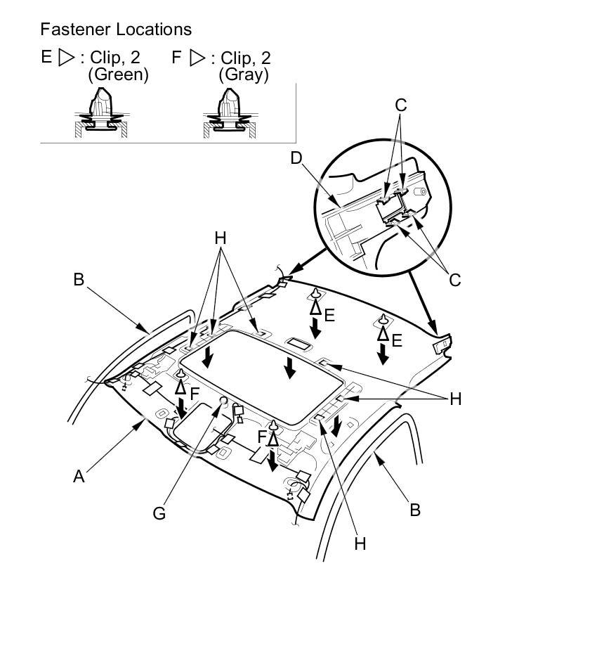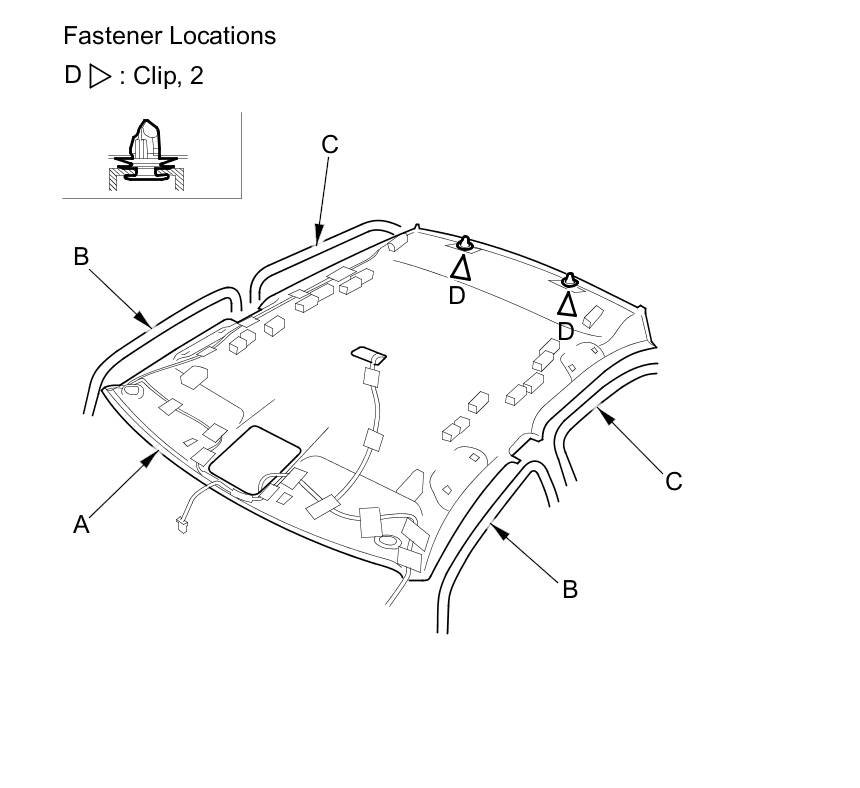 2. With the help of an assistant, detach the rear clips (D) by pulling down the rear area of the headliner.