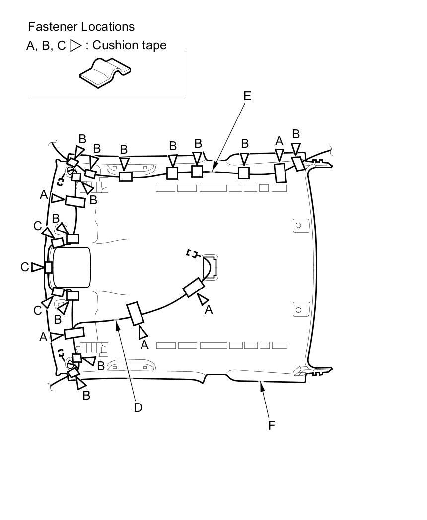 22. If necessary, remove the cushion tape (A, B, C) fastening the roof wire harness (D) and the antenna lead (E) to the headliner (F), then remove them from the headliner.
