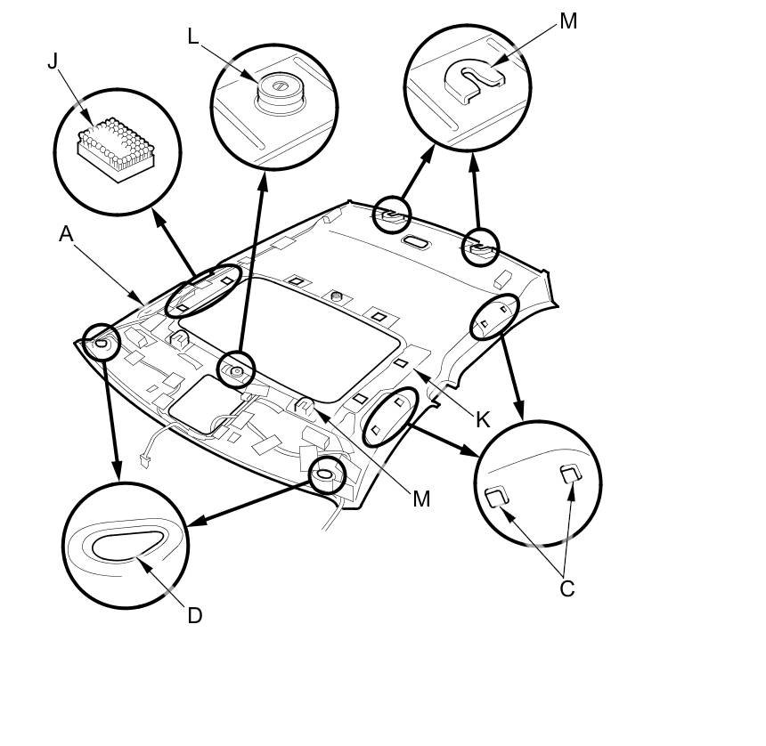 - Any fastener bases (J), stiffeners (K), magnets (L), or the clip bases (M) which have come off the headliner