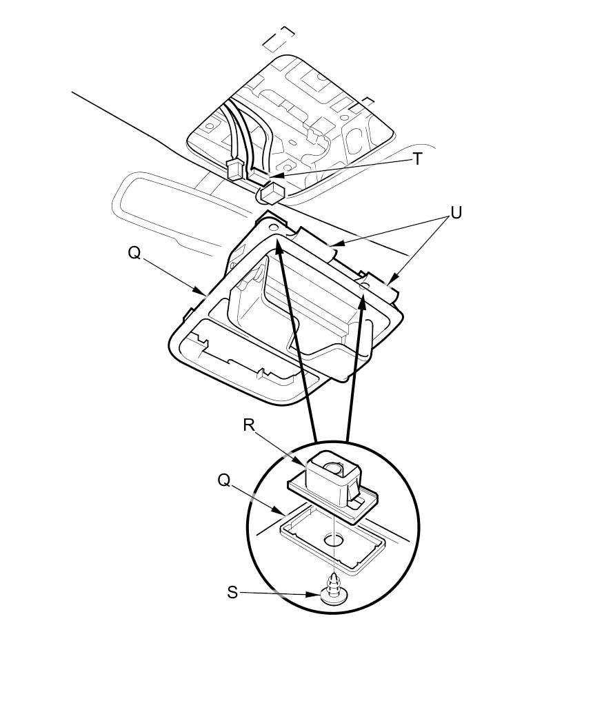 - Install the roof console screw grommets (R) on the console with the screws (S).