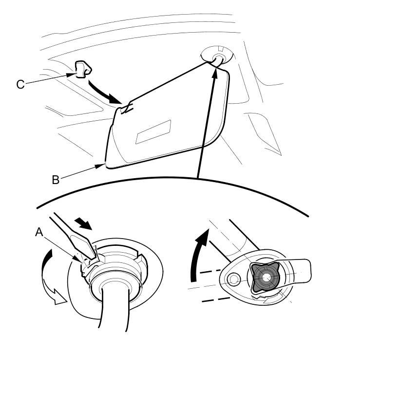 2. While pushing in the hook (A) with a flat-tip screwdriver, release the sunvisor (B) from the holder (C), and rotate the sunvisor backward 45 °. Make sure the hook slides into the bracket cover as you rotate the sunvisor.