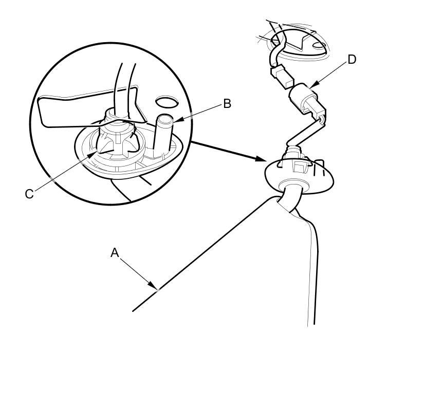 3. Pull down the sunvisor (A) to release the pin (B) and the bracket (C) from the holes in the body. Then pull out the vanity mirror light connector (D) and disconnect it.