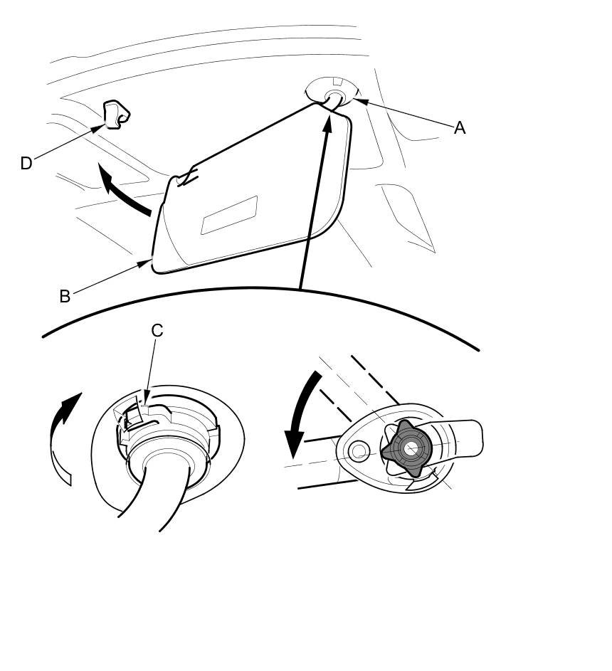11. While holding the bracket cover (A), rotate the sunvisor (B) forward until the hook (C) snaps into place. Gently pull down on the sunvisor to make sure it is properly secured in the body. Rotate the sunvisor into the holder (D).